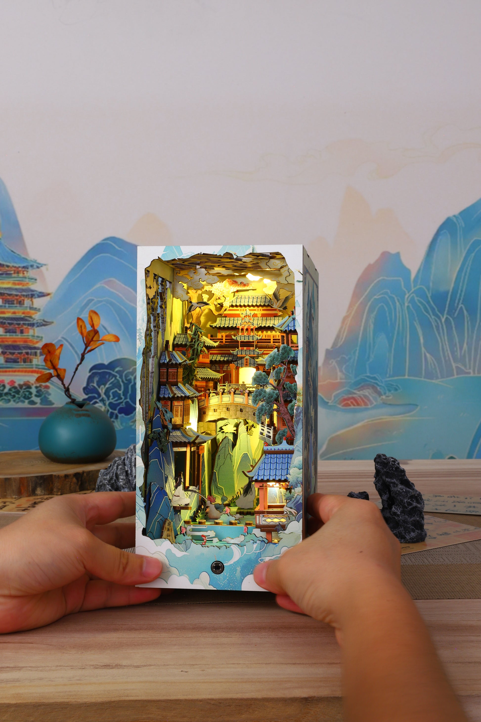 Penglai's Fairyland captures the mystical beauty of a floating mountain, where the peaceful harmony between humanity and nature unfolds. Designed as a layered, towering peak, this enchanting scene features intricately carved pavilions nestled within the mountainside, symbolizing the dwelling place of immortals. The gentle interplay of lush greenery, flowing waters, and ancient architecture conveys a deep connection to nature, embodying the idea of humans living in balance with the natural world. Penglai's Fairyland invites the viewer into a serene, otherworldly realm, where nature and mysticism intertwine in perfect harmony.