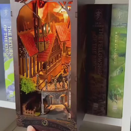Discover the Magic Valley Rings Book Nook (SQ05) by Hamileon, a captivating window into a world of fantasy and legend. This 3D puzzle kit lets you build an enchanted village, complete with suspended houses and flowing rivers, all framed by the appearance of ancient tomes on your bookshelf.