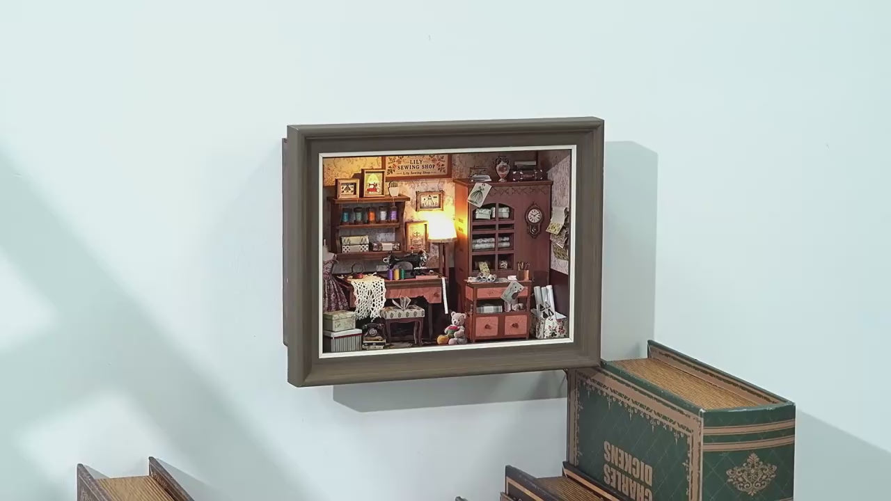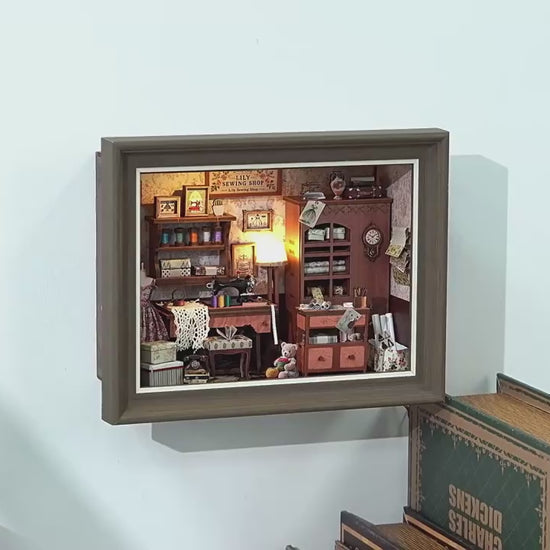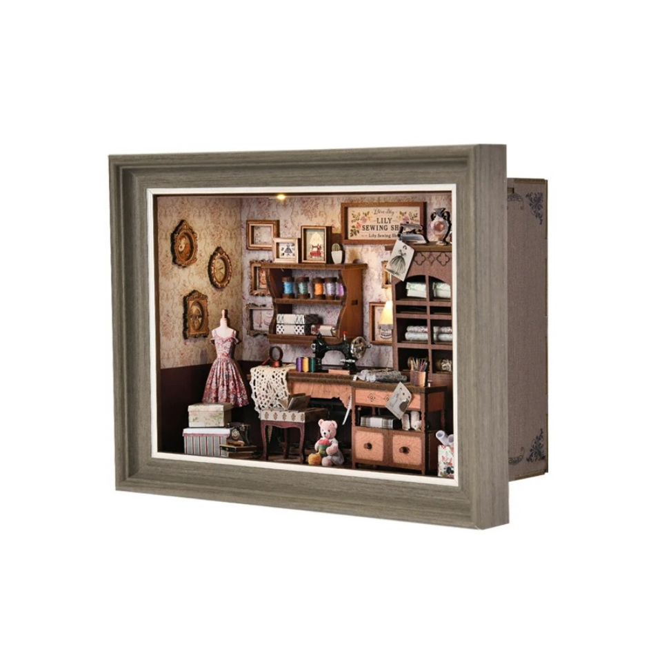 The Hamaileon ZR-01 "Lily's Sewing Shop" is not a standard picture frame, but rather a DIY 3D wooden puzzle book nook kit that includes integrated LED lighting. It is designed to be a miniature scene that fits on a bookshelf or desk, featuring detailed elements of a sewing atelier.