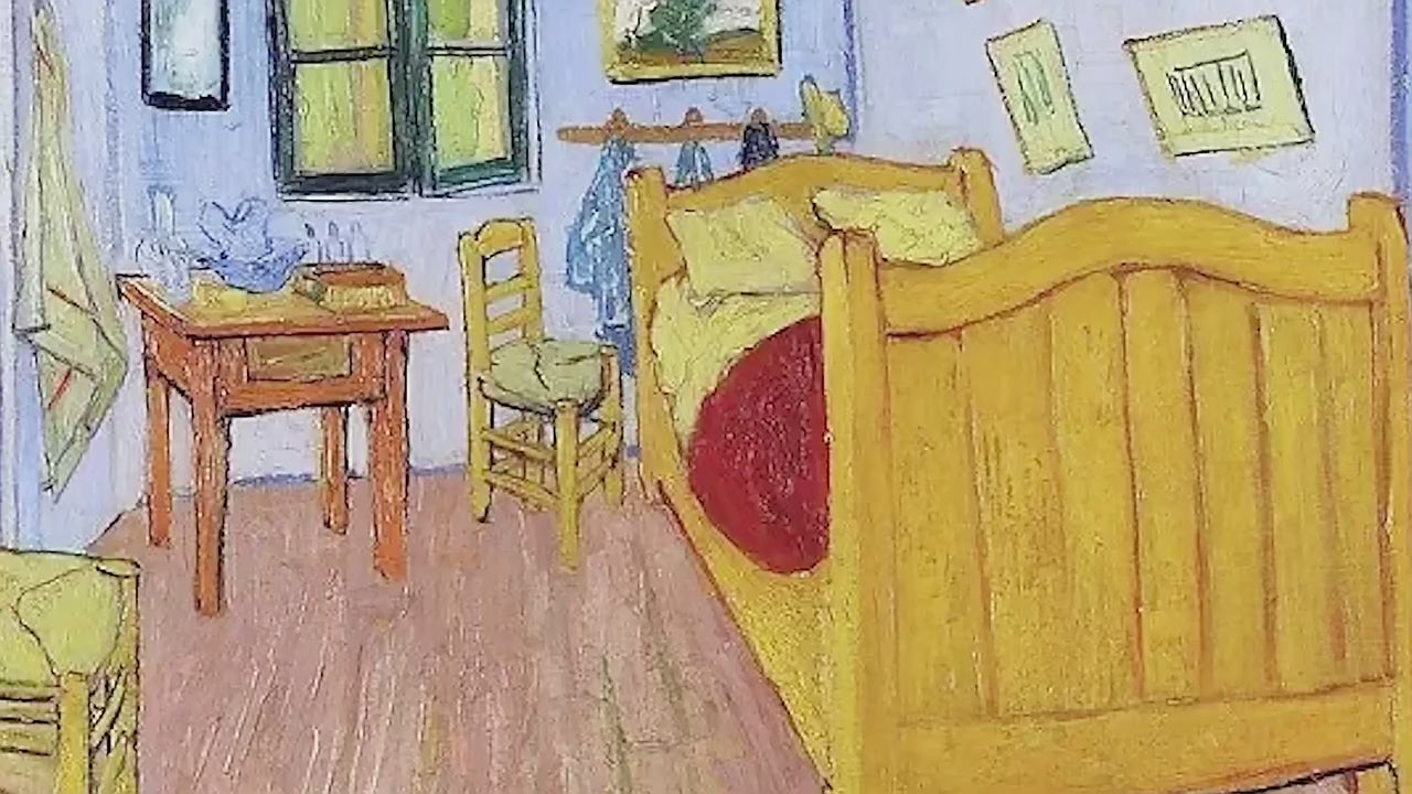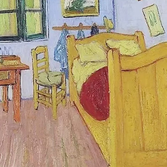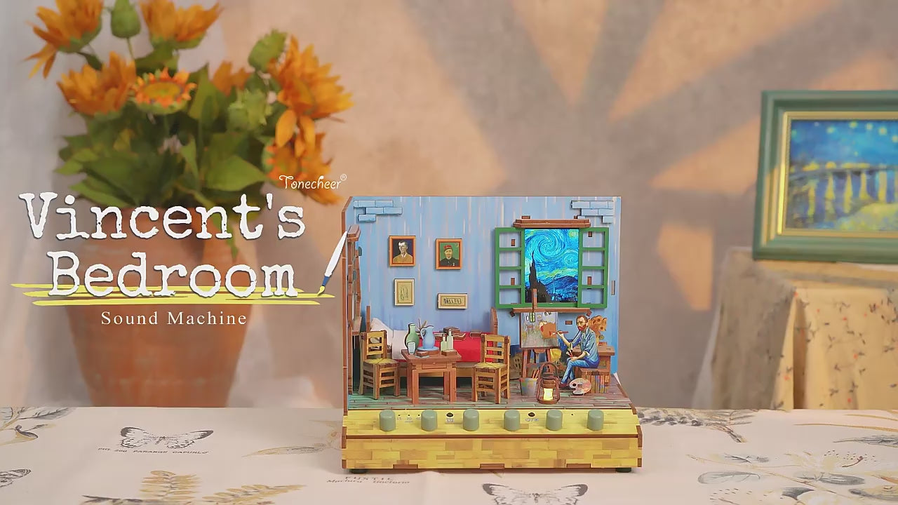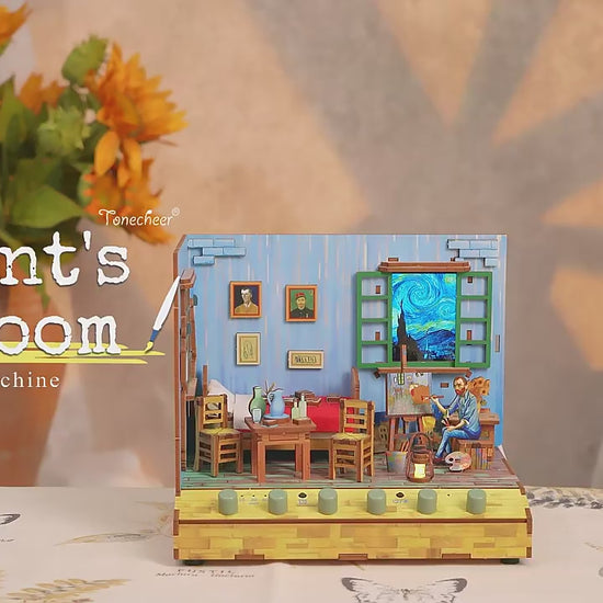 n the oil painting style cottage, Vincent was working on a painting modeled after his own bedroom. The sunflowers on the table, the portraits on the wall, and the starry night outside the window are full of Van Gogh's artistry.