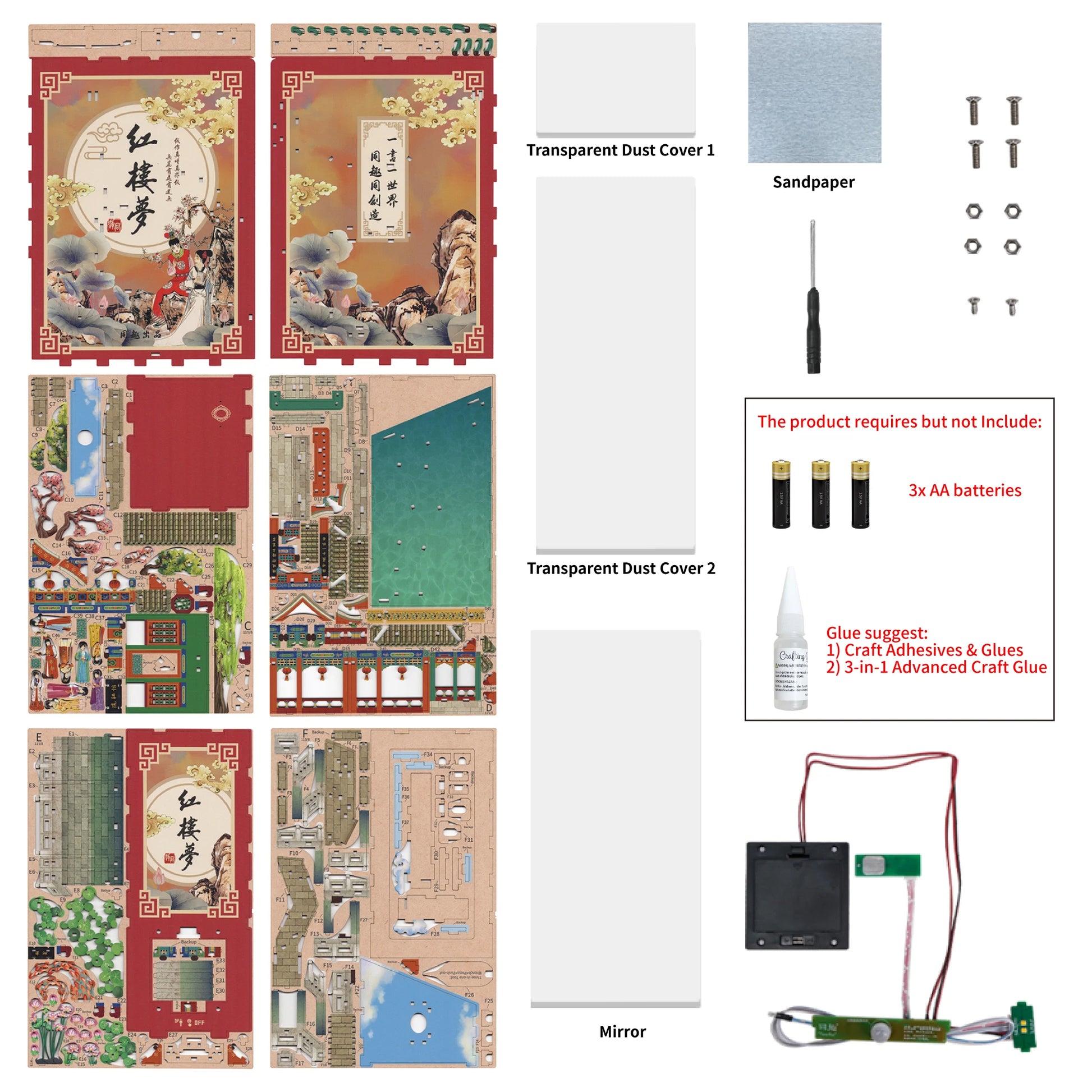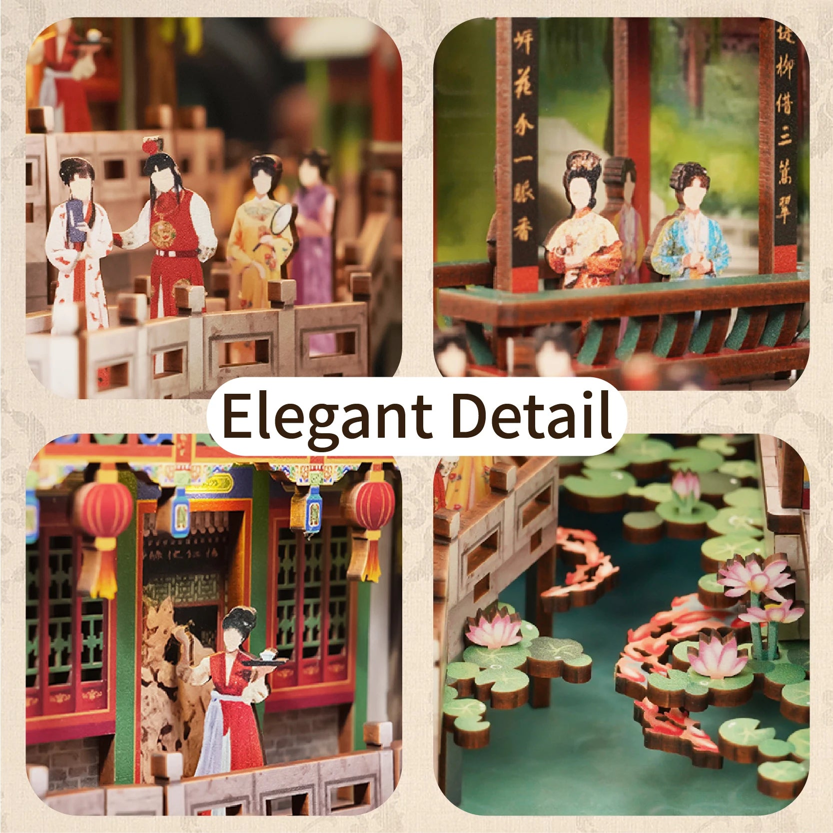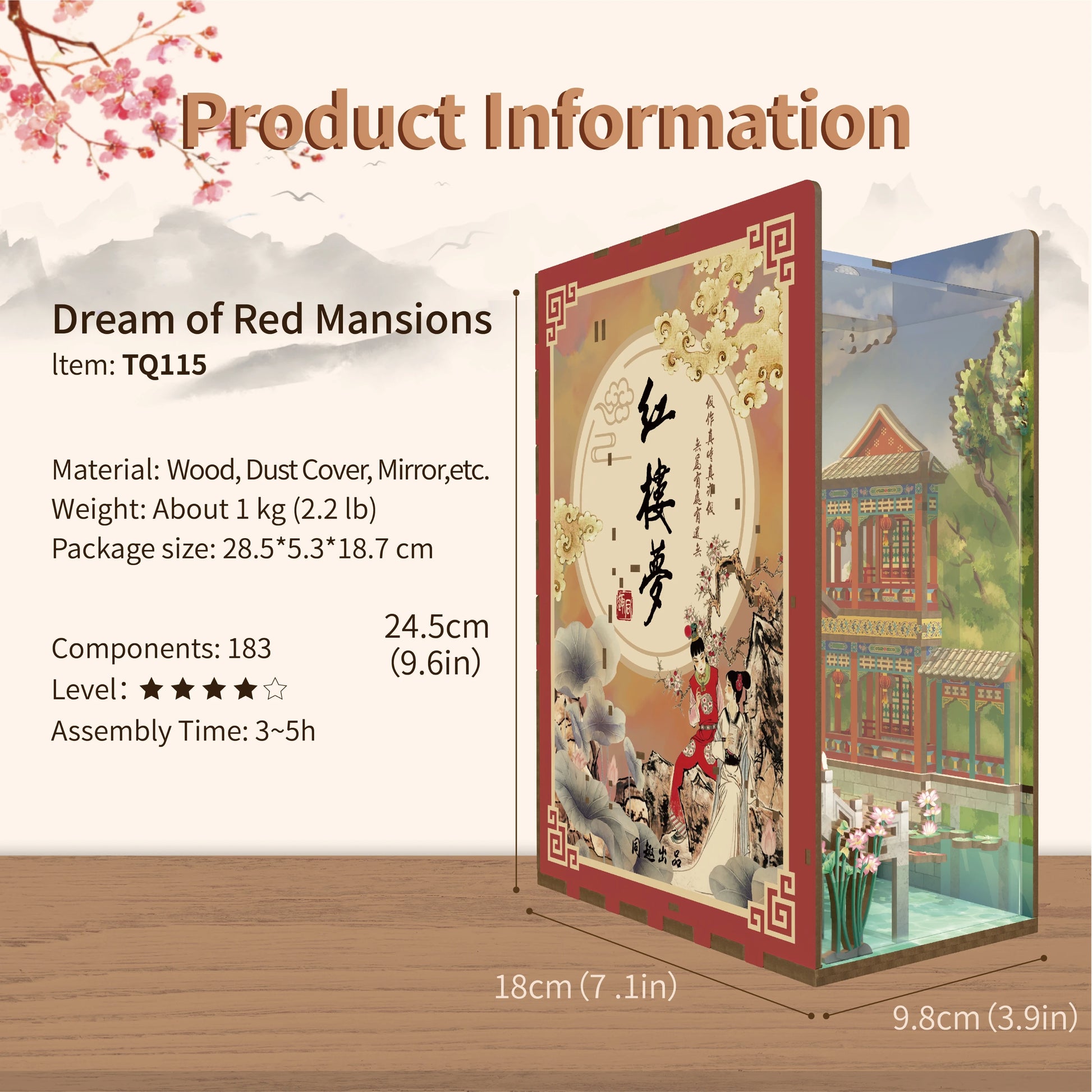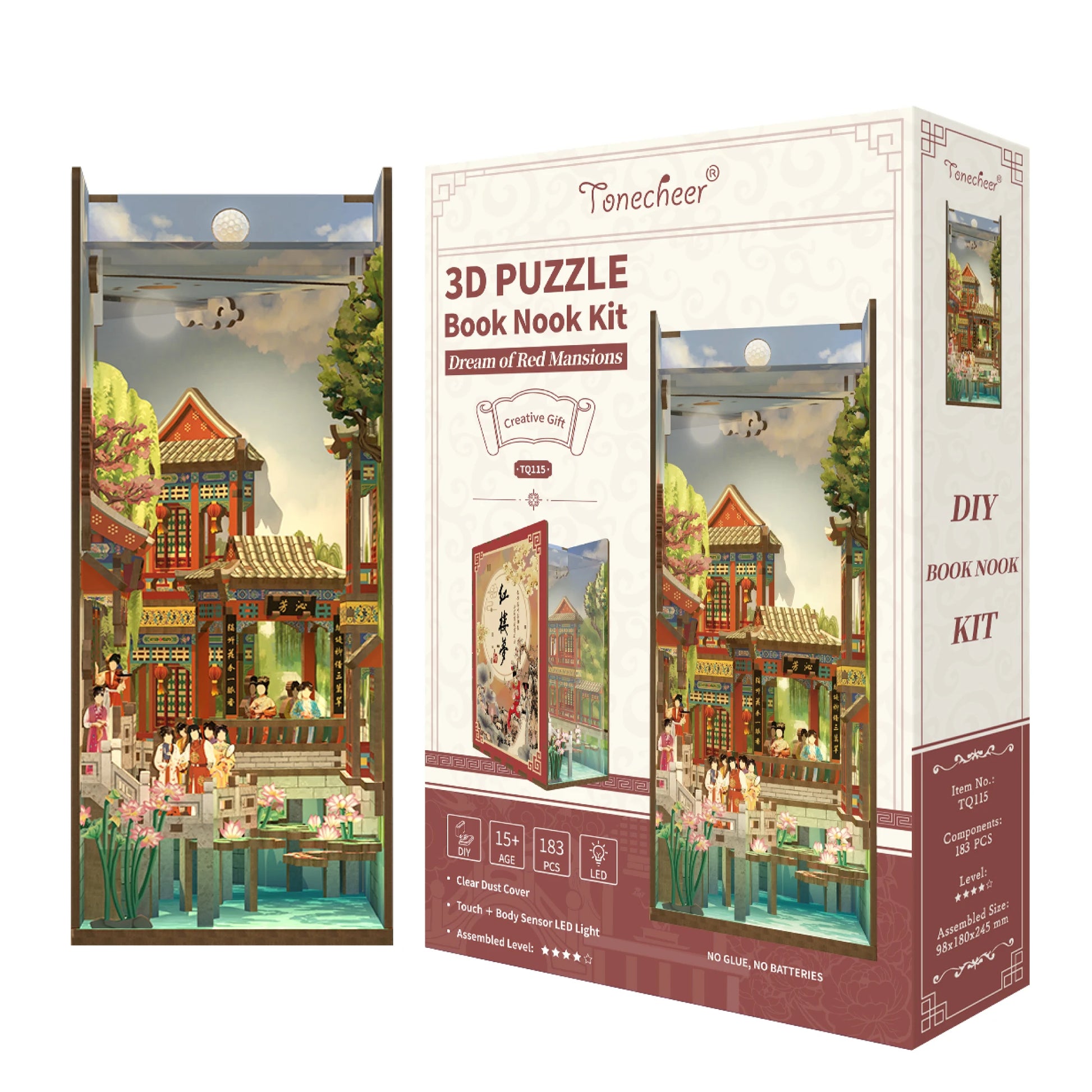 - Dream of Red Mansions: Tonecheer DIY Chinese style book nook kit with dust cover is inspired by the renowned Chinese literary masterpiece “Dream of Red Mansions”. The 3D Chinese puzzle vividly showcases the romantic scene of characters from the book walking through pavilions and watching blooming lotus flowers together.