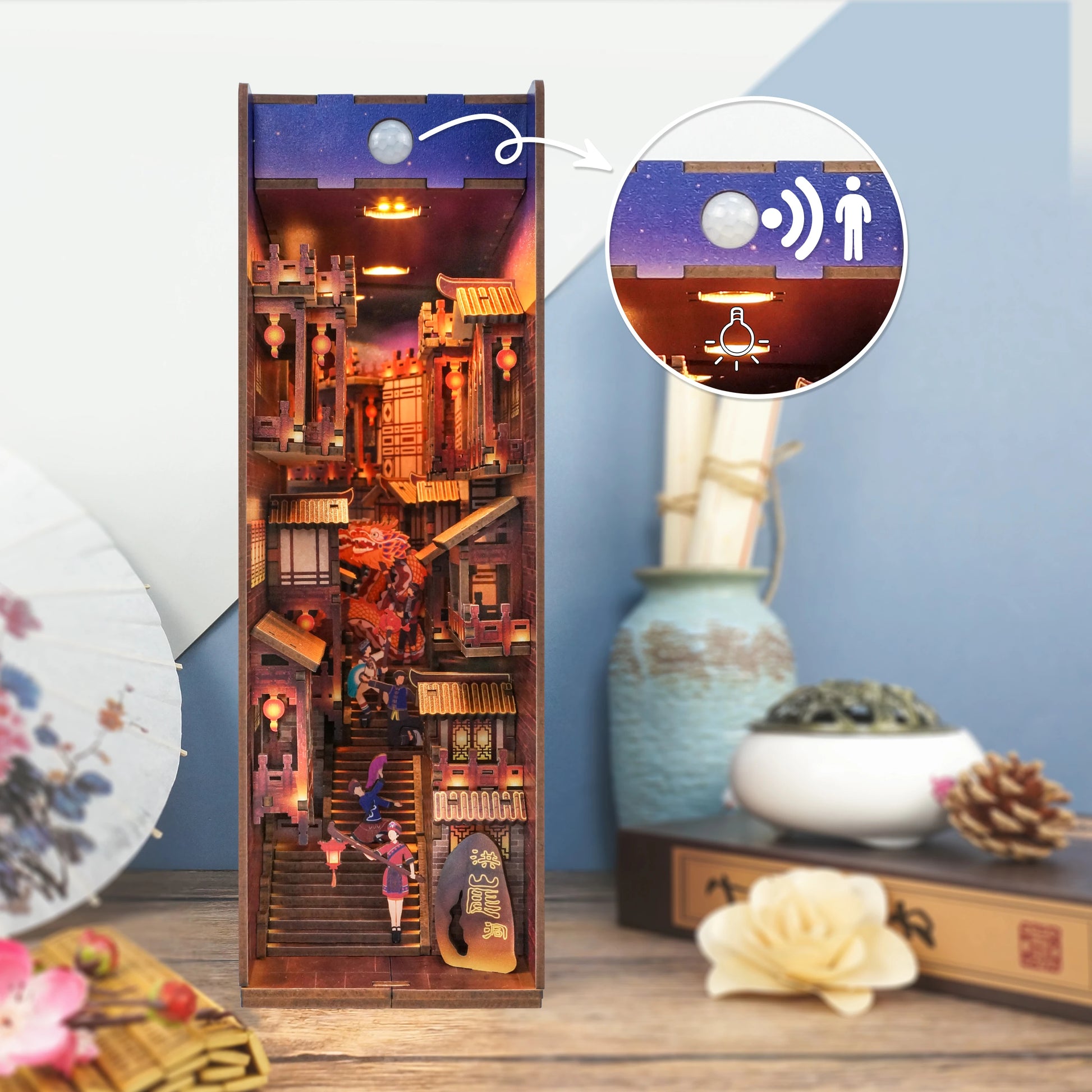 - Auto Sensor Light: Tonecheer Chinese style book nook DIY kits for adults features smart auto-sensing light which turns on when you approach, and automatically turns off after 1 to 2 minutes. The sensing distance of body varies between 0.5 to 3 meters, depending on the changing of environmental temperatures.