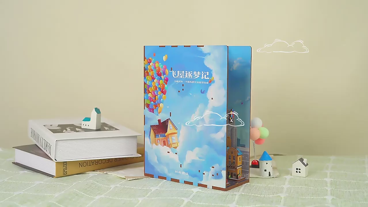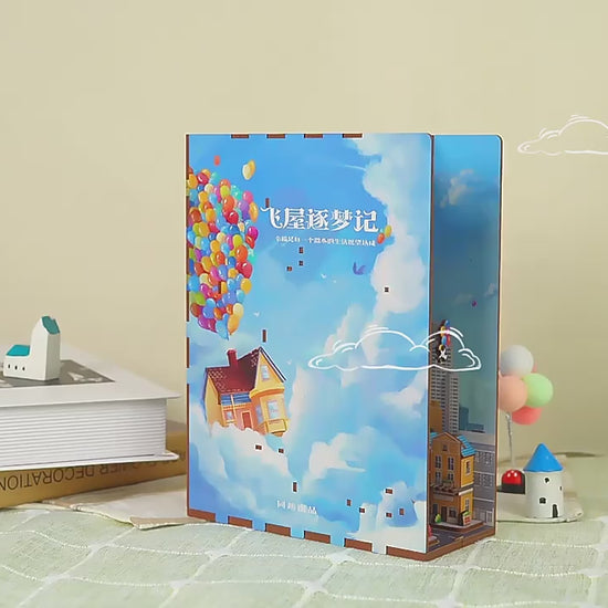 - Travel with The Wind DIY book nook kit: Stories often begin with a dream, and people want to have a flying house of their own to experience a magnificent adventure. Colorful balloons take off with the house, and the journey into the unknown is exhilarating.